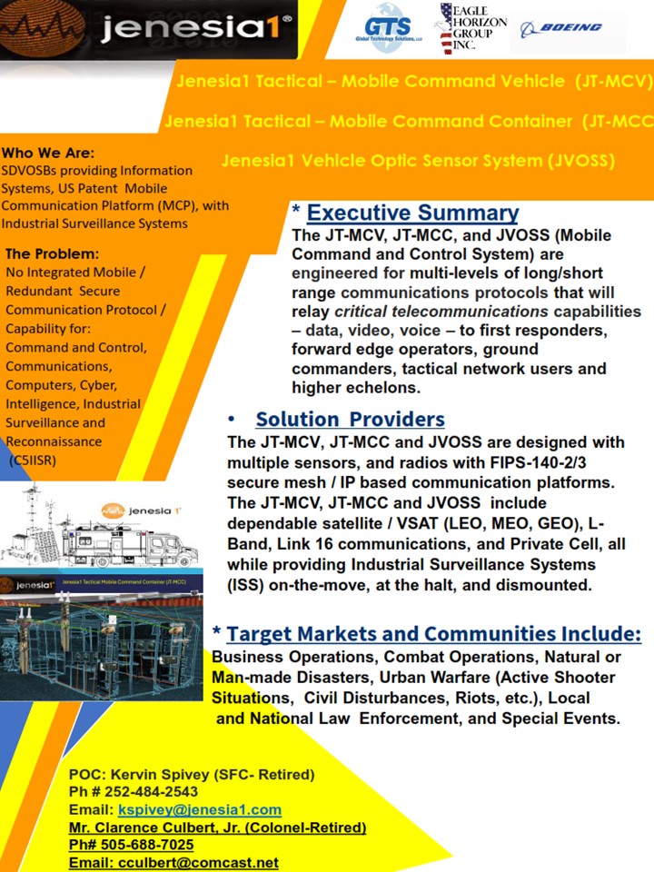Jenesia1, founded in 2010 by a U.S. Army veteran and telecommunications engineer, is a certified Service-Disabled Veteran-Owned Small Business (SDVOSB). We specialize in advanced information systems and physical security solutions, leveraging our expertise to deliver innovative, reliable, and secure platforms. Our patented Mobile Communication Platforms—including the Jenesia1 Tactical Mobile Command Vehicle (JT-MCV), Tactical Mobile Command Container (JT-MCC), Vehicle Optic Sensor System (JVOSS), Jenesia1 Products of High Performance and Secure Network Infrastructure (JPHP-SNI), and commercial off-the-shelf technology with proprietary designs to meet the evolving demands of our clients. As subject matter experts, we are committed to continuous innovation, ensuring our solutions remain at the forefront of technology to address tomorrow’s challenges.