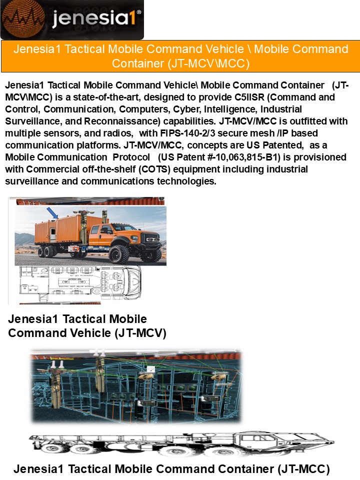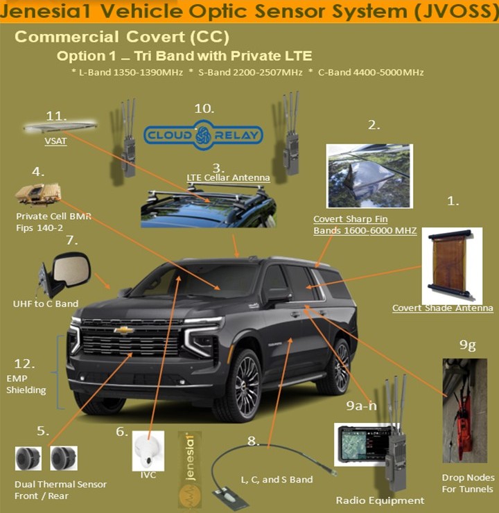 JVOSS (Jenesia1 Vehicle Optic Sensor System) is an added enhanced feature to your vehicle of choice, a telecommunication protocol supplying mobile command and control. JVOSS is designed for secure long- and short-range communications, relaying critical data, video, and voice to first responders, forward operators, commanders, tactical users, and higher echelons.